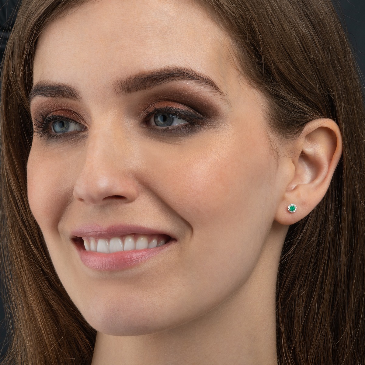 These simple green emerald and diamond stud earrings include brilliant cut diamonds with a total weight of 0.08ct. These are carefully set to complement the pair of emerald gemstones which are round and weigh 0.25ct.