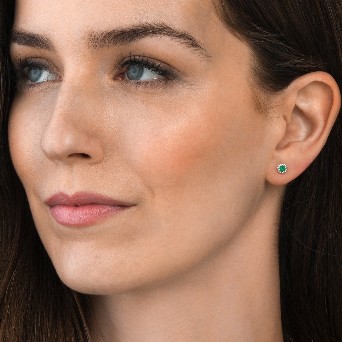 These gorgeous green emerald and diamond ear studs feature brilliant cut diamonds with a total weight of 0.08ct. These are cleverly set to complement the featured green emerald which is round and weighs 0.30ct. These ear studs are crafted in 18K white gold and complete with a pair of push on butterfly backs. The brilliance of the diamonds in combination with the green emerald gemstones set in white gold is perfect.