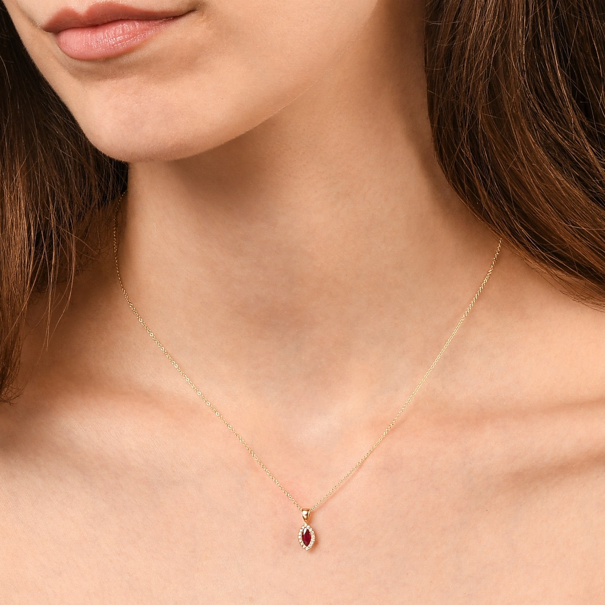 This tempting red ruby and diamond pendant features a marquise shaped ruby which is perfectly complimented by the surrounding diamonds. The ruby is 3mm x 6mm and weighs 0.30ct; the diamonds weigh 0.05ct. This necklace is made in 18K yellow gold and comes complete with a beautiful mirror trace chain.