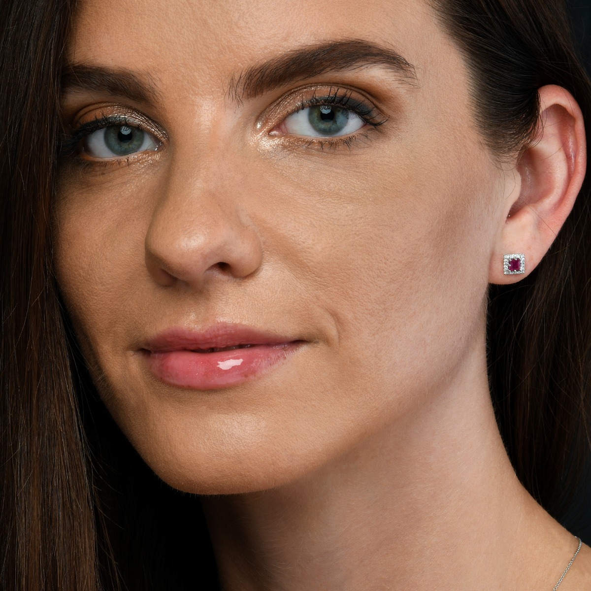 These striking red ruby and diamond stud earrings have brilliant cut diamonds with a total weight of 0.11ct. These are delicately set to complement the featured red ruby which is square in shape and weighs 0.65ct. These earrings are crafted in 9K white gold and are complete with a pair of push on butterfly backs. The brilliance of the diamonds in combination with the red ruby gemstones set in white gold is perfect.