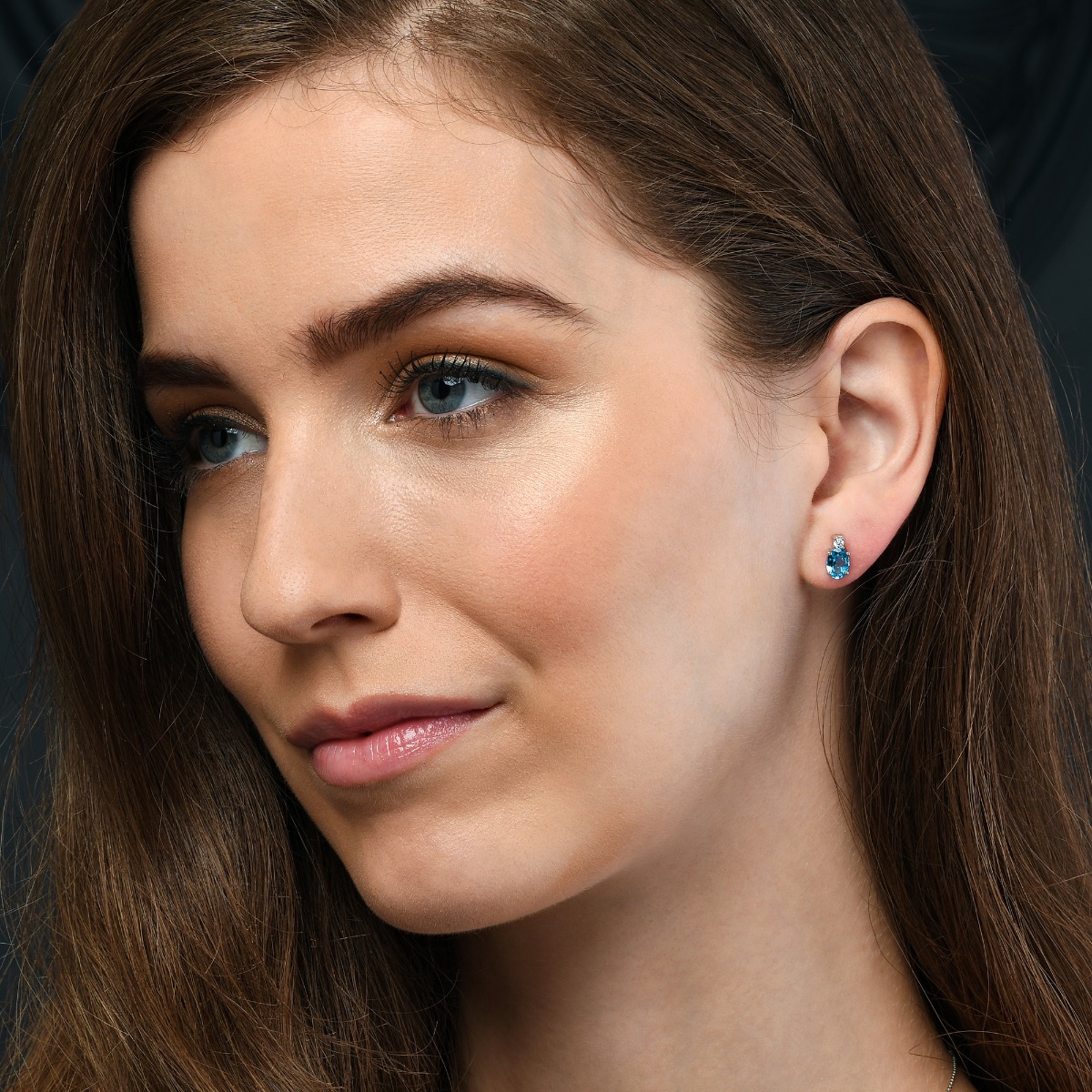 These alluring blue topaz and diamond stud earrings have brilliant cut diamonds with a total weight of 0.07ct. These are cleverly set to complement the featured blue topaz which is oval shape and measures 5mm by 7mm. The topaz weigh 1.50ct. These earrings are crafted in 9K white gold and include attractive ear hooks. The brilliance of the diamonds in combination with the blue topaz gemstones set in white gold is right for any occasion.