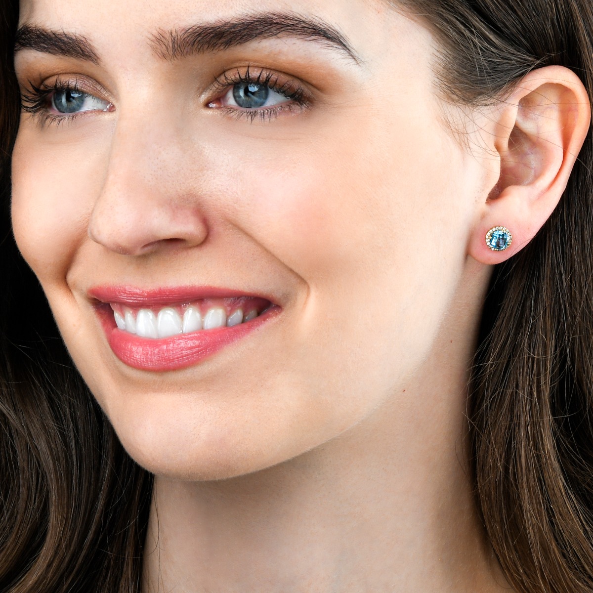 These gorgeous blue topaz and diamond stud earrings feature brilliant cut diamonds with a total weight of 0.12ct. These are carefully set to complement the featured blue topaz which is round and measures 6mm. The topaz weigh 2.00ct. These earrings are crafted in 18K yellow gold and are complete with a pair of push on butterfly backs. The brilliance of the diamonds in combination with the blue topaz gemstones set in yellow gold is lovely.