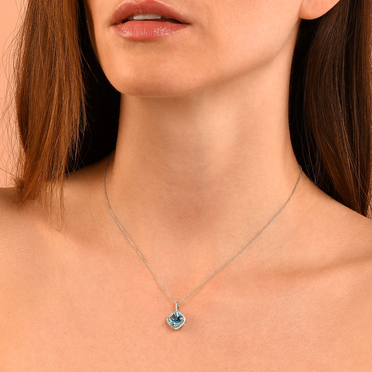 This stunning blue blue topaz and diamond pendant features a cushion shaped blue topaz which is perfectly complimented by the surrounding diamonds. The blue topaz is 8mm x 8mm and weighs 2.50ct; the diamonds weigh 0.14ct. This necklace is made in 9K white gold and comes complete with a beautiful mirror trace chain.