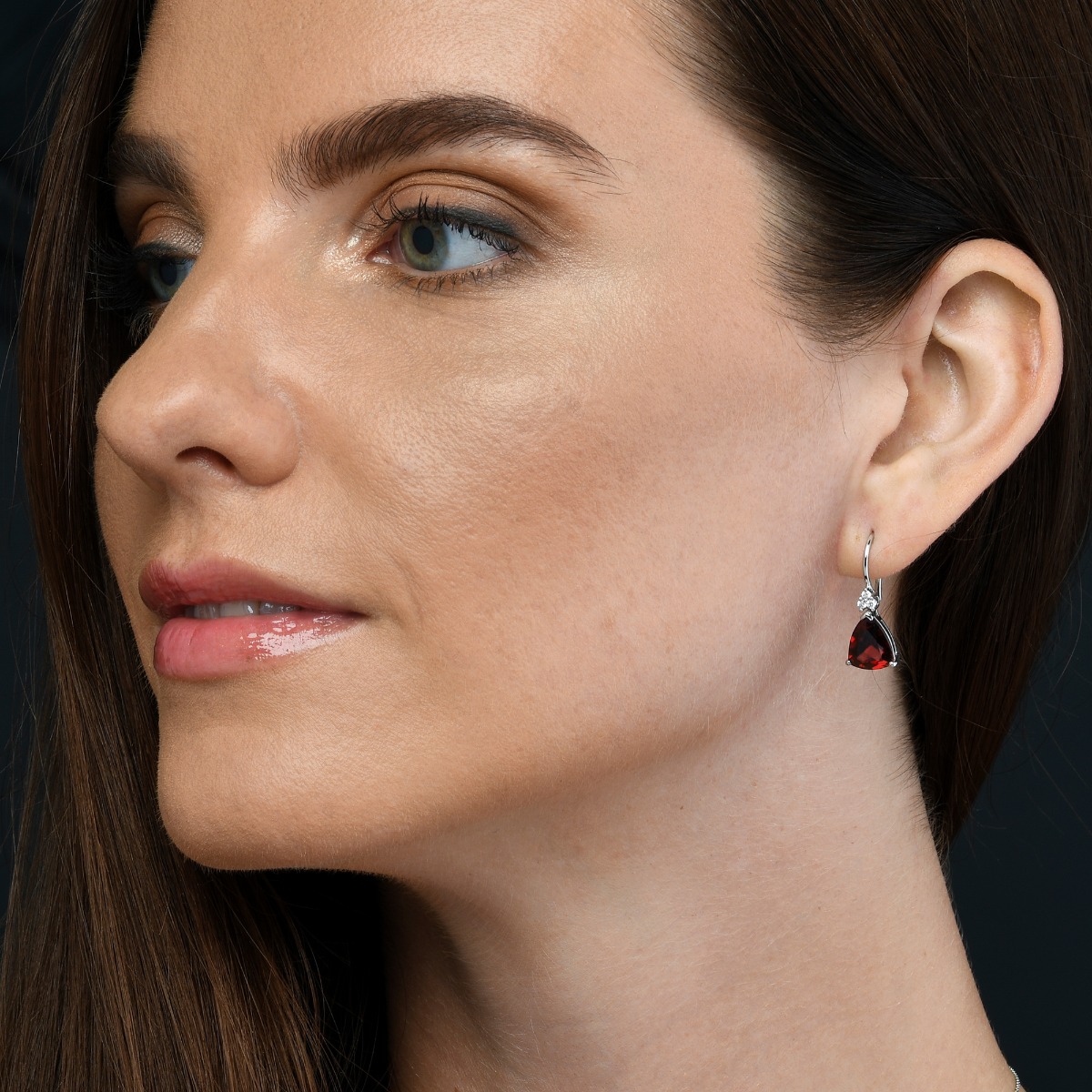 These beautiful maroon garnet and diamond earrings feature brilliant cut diamonds with a total weight of 0.10ct. These are delicately set to complement the featured maroon garnet which is trillion cut and measures 8mm by 10mm. The garnets weigh 6.00ct. These earrings are crafted in 9K white gold and include elegant ear hoops. The brilliance of the diamonds in combination with the maroon garnet gemstones set in white gold make these earrings perfect for any occasion.