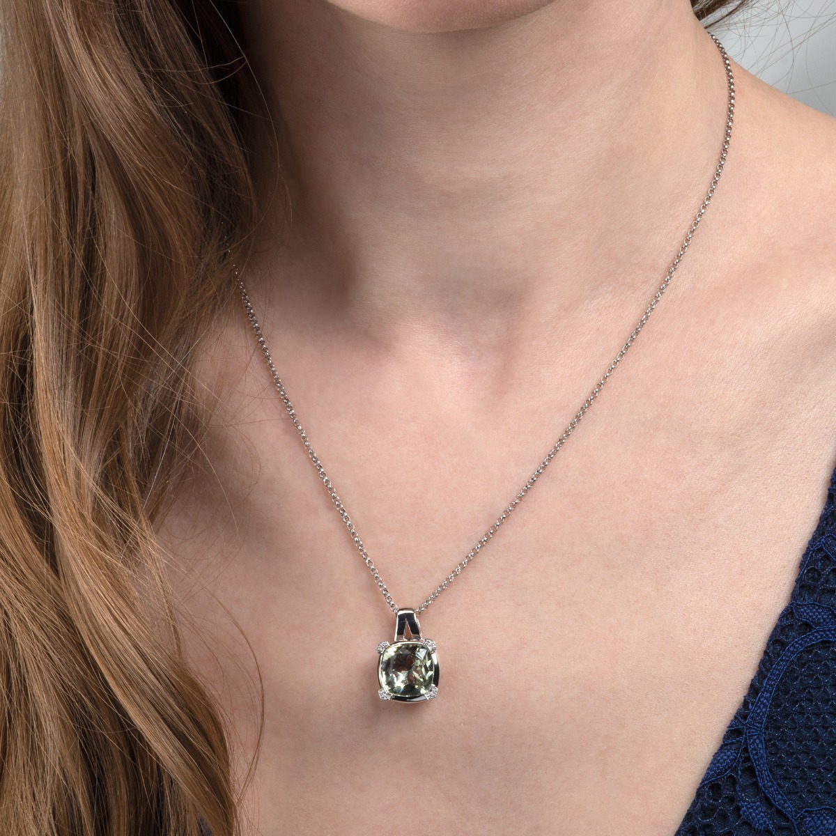 This elegant green amethyst pendant necklace features a cushion-cut green amethyst - Prasiolite - gemstone which is elegantly complemented with diamond claw settings. The green amethyst is cut in a 12 mm x 12 mm cushion cut and weighs 6 ct and the diamonds weigh 0.04ct. The simple lines combine with bold gemstones, strikingly magnificent in diamond claw settings. This necklace is made in 18K white gold and comes complete with an 18-inch long 18K white gold chain. Understated yet audacious, classic yet contemporary.