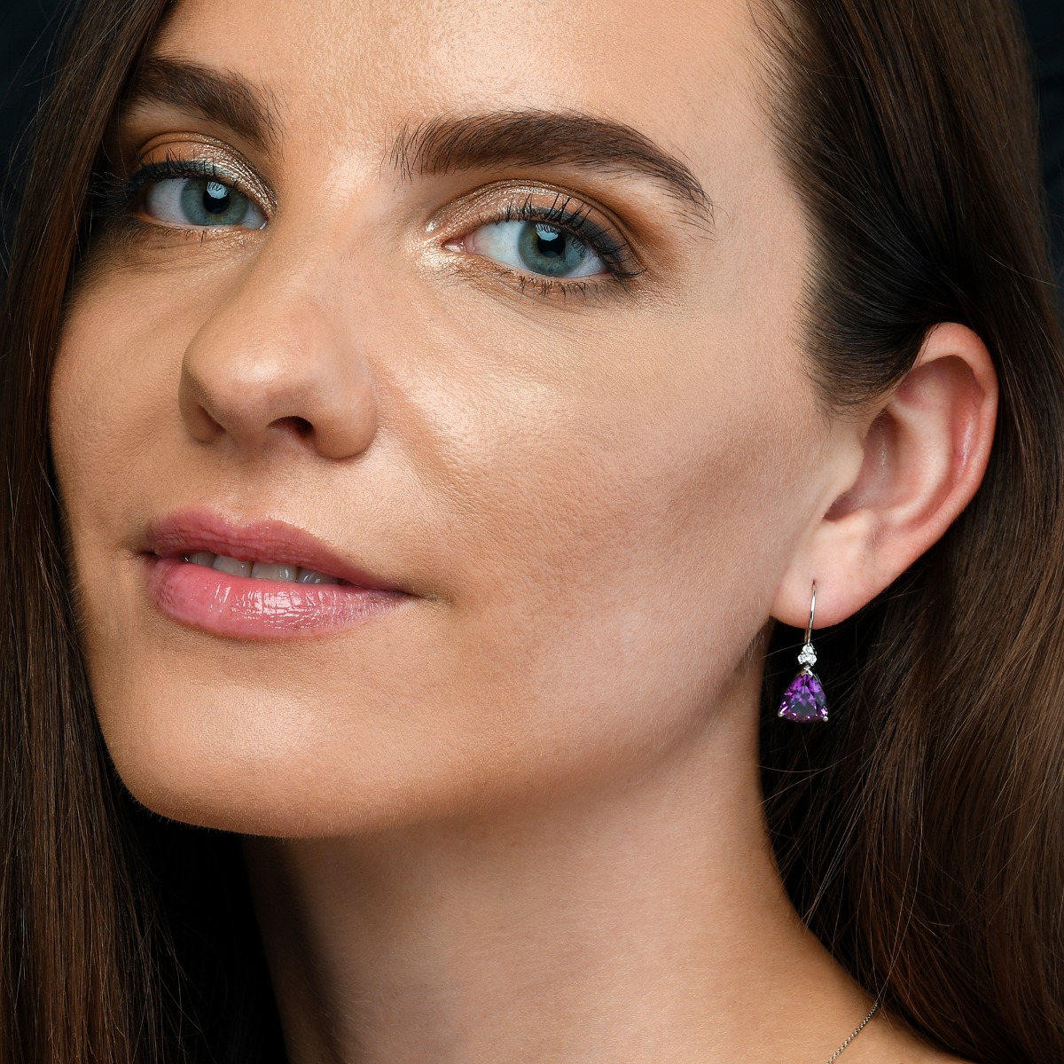 These radiant purple amethyst and diamond earrings have brilliant cut diamonds with a total weight of 0.10ct. These are carefully set to complement the featured purple amethyst which is trillion cut and measures 8mm by 10mm. The amethysts weigh 4.60ct. These earrings are crafted in 9K white gold and include elegant ear hoops. The brilliance of the diamonds in combination with the purple amethyst gemstones set in white gold is stunning.
