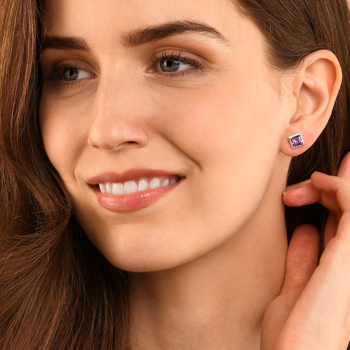These radiant purple amethyst and diamond stud earrings have brilliant cut diamonds with a total weight of 0.19ct. These are carefully set to complement the featured purple amethyst which is square shape and measures 5mm by 5mm. The amethysts weigh 1.35ct. These earrings are crafted in 9K white gold and are complete with a pair of push on butterfly backs. The brilliance of the diamonds in combination with the purple amethyst gemstones set in white gold is lovely.