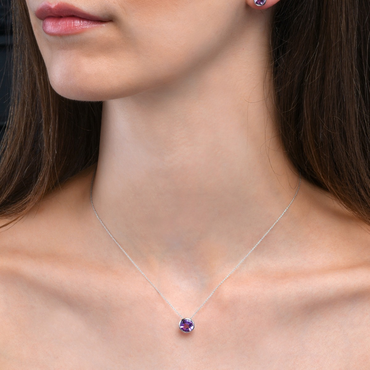 With a single round stone reminiscent of the solitaire, an 8mm Amethyst gemstone is set in a simple bezel setting, on a dainty silver chain.