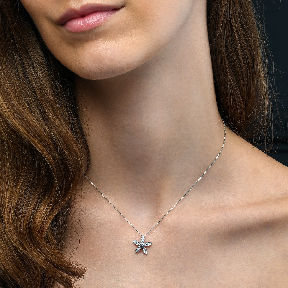 This charming white gold cluster diamond pendant has 0.25ct brilliant round diamonds set to create a dazzling effect in a flower formation. This necklace is made in 18K white gold and comes complete with a beautiful mirror trace chain.