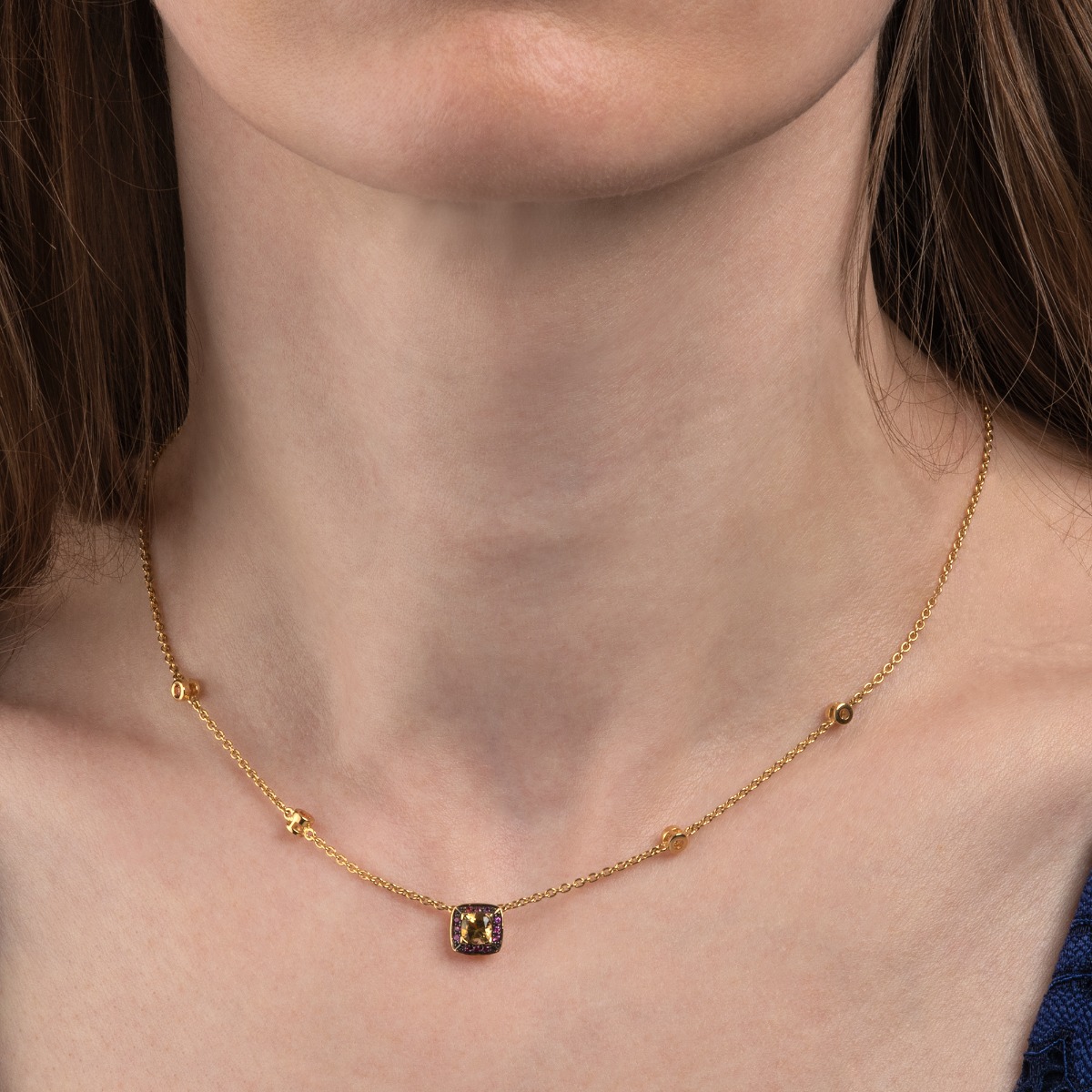 This stunning citrine and pink sapphire necklace is set with 0.42ct of citrine, 0.17ct of orange sapphire and 0.10ct of pink sapphire gemstones. Audacious and striking the bright pink of the sapphires complements gracefully the deep yellow of the citrine. This cushion shaped pendant on a gem studded chain is crafted in 18K yellow gold. Classic yet contemporary, this colourful necklace is sure not to go unnoticed.
