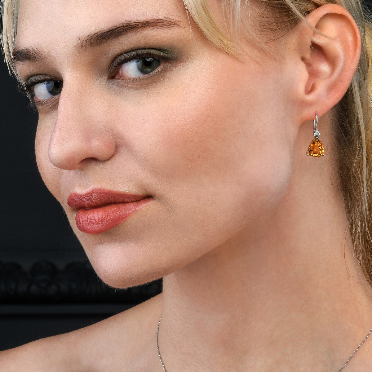 These classic yellow citrine and diamond earrings include brilliant cut diamonds with a total weight of 0.10ct. These are carefully set to complement the featured yellow citrine which is trillion cut and measures 8mm by 10mm. The citrines weigh 4.60ct. These earrings are crafted in 9K white gold and include elegant ear hoops. The brilliance of the diamonds in combination with the yellow citrine gemstones set in white gold is a perfect combination.