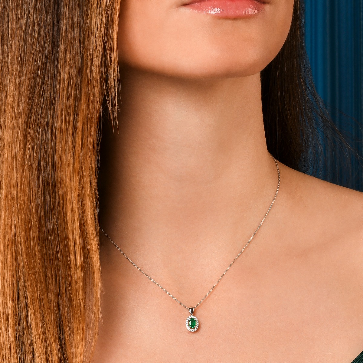 This elegant green Emerald and diamond pendant features an oval shaped Emerald which is beautifully complimented by a halo of round diamonds around it. The Pendant is designed with a tiny gap between the diamonds and the centre Emerald making the Emerald stand out above the diamonds. The Emerald is 4mm x 6mm in dimensions and the total diamond weight is 0.14ct. This necklace is made in 18K white gold and comes complete with a beautiful mirror trace chain.