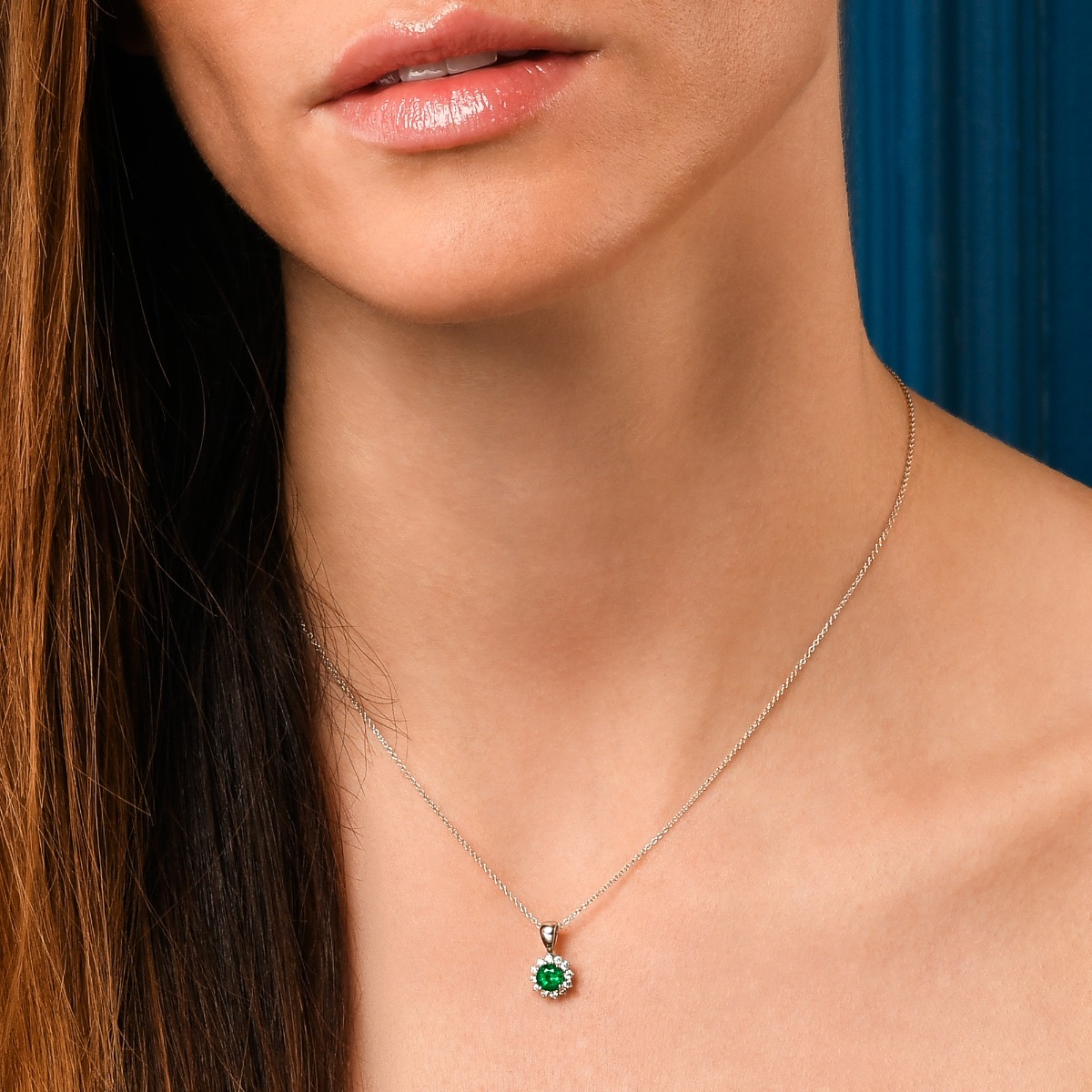 This elegant green Emerald and diamond pendant features an round cut Emerald which is beautifully complimented by a line of round diamonds set around it. The Pendant is designed with the centre Emerald slightly raised above the diamonds around it. The Emerald is 5mm in diameter and the total diamond weight is 0.17ct. This necklace is made in 9K white gold and comes complete with a beautiful mirror trace chain.