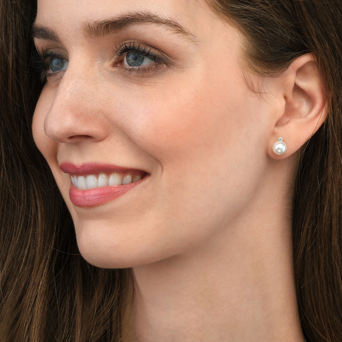These classic freshwater pearl and diamond earrings have single brilliant cut round diamonds with a total weight of 0.08ct set to compliment these beautiful 8mm white freshwater pearls. These pearl earrings are made in 9K white gold complete with a pair of push-on butterfly backs.