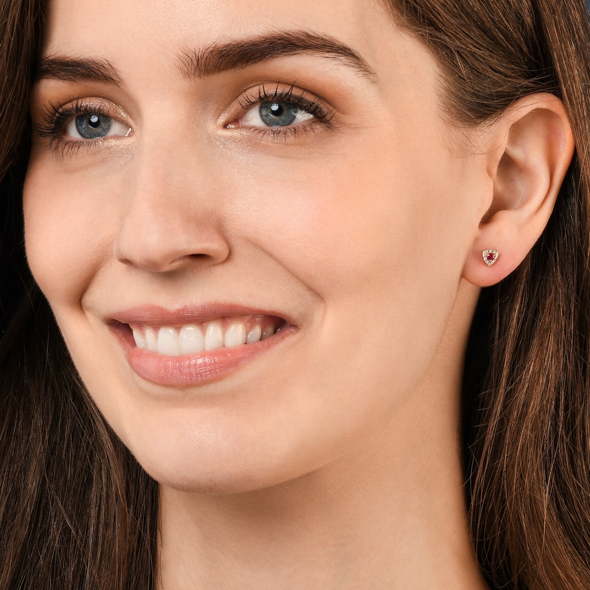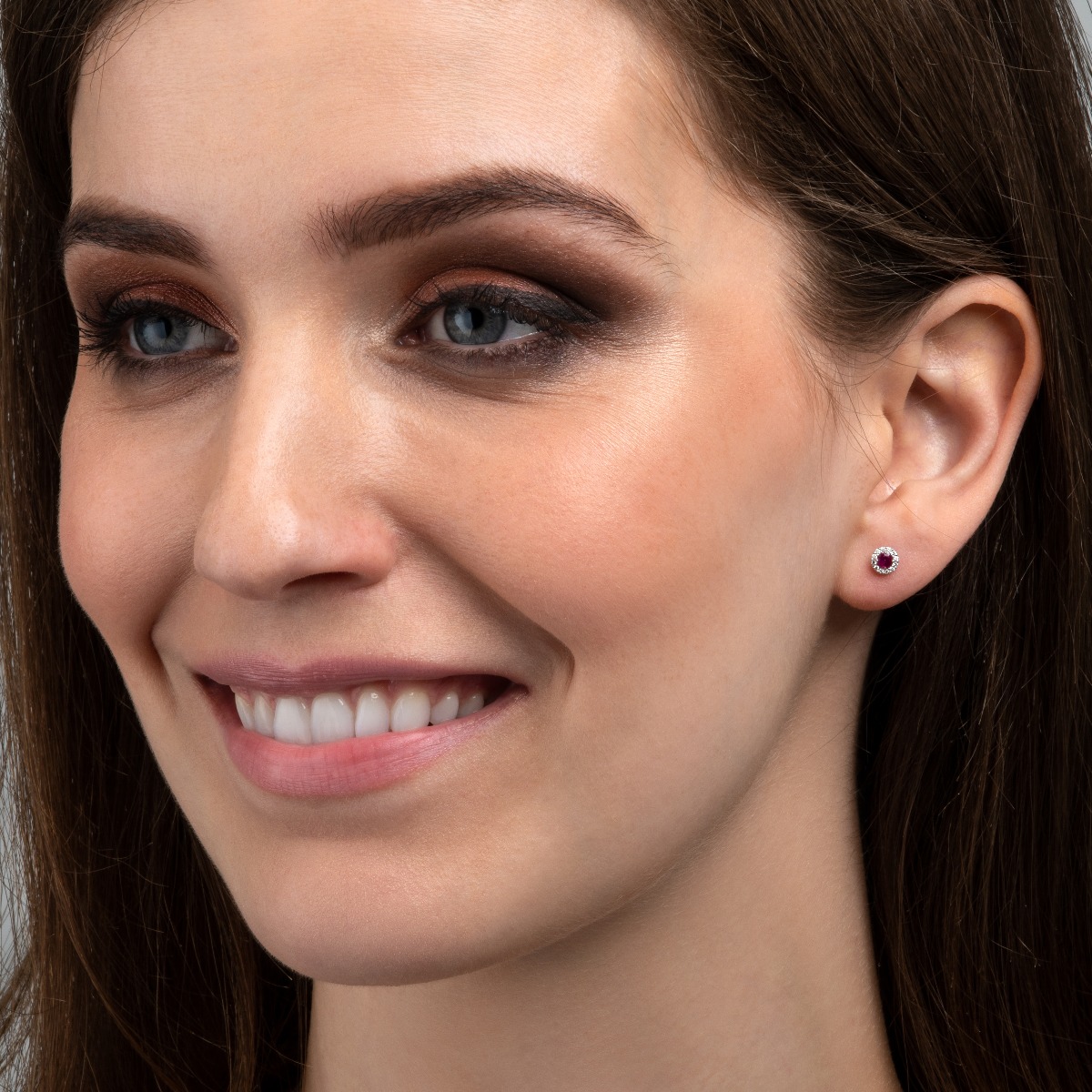 Ruby Earrings set with diamonds in 9K and 18K white and yellow gold. A stunning selection of ruby earrings and ruby studs designed to create a unique collection of jewellery for all occasions. Browse through our stunning variety of modern halo designs as well as a classic collection of earrings in a variety of shapes and sizes of rubies! Ruby is a gem of high cultural and historical importance, just like its counterpart, the sapphire. Did you know that the word ruby comes from the word “ruber” which means red in Latin? Rubies are also famous for being extremely strong and resistant to wear. They very resilient and only a bit softer than diamonds, measuring 9 out of 10 on Mohs hardness scale! Rubies are often related strongly to the essence of life. Rubies are also associated with love, passion and strong feelings of affection due to their vibrant deep red hue. In antiquity they were famously considered as some of the most significant gifts in a new relationship and are nowadays considered as some of the most coveted Valentine's Day gifts and Birthday gifts. By many considered as the king of precious gems it is the Birthstone of the month July. The ruby earrings we offer come in many different, elegant shapes, sizes and designs. We offer some of the most tasteful ruby earring studs that are hard to take your eyes off. Everlasting jewellery for everlasting relationships. Our ruby studs are made with care and with the gemstone's age-old significance in mind. The joy, the life, the passion this stone symbolises will mark the beginning for a successful relationship. Why wait? Fulfil your and your loved one's wishes with our stunning pieces of ruby jewellery. Life is about giving, and a thoughtful, meaningful gift is something that will remain forever in the memories of our loved ones.