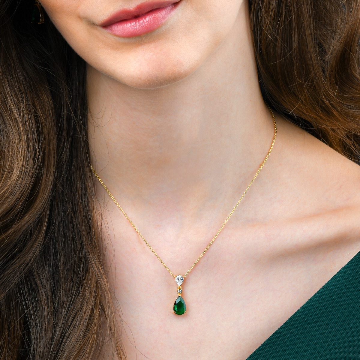 This elegant and distinguished green gold pendant necklace is elegantly set with a pear-shaped green stone with a smaller sparkling pear-shaped cubic zirconia stone on top. The green stone and the cubic zirconia stones are brought together in refined, elegant gold plated sterling silver settings.