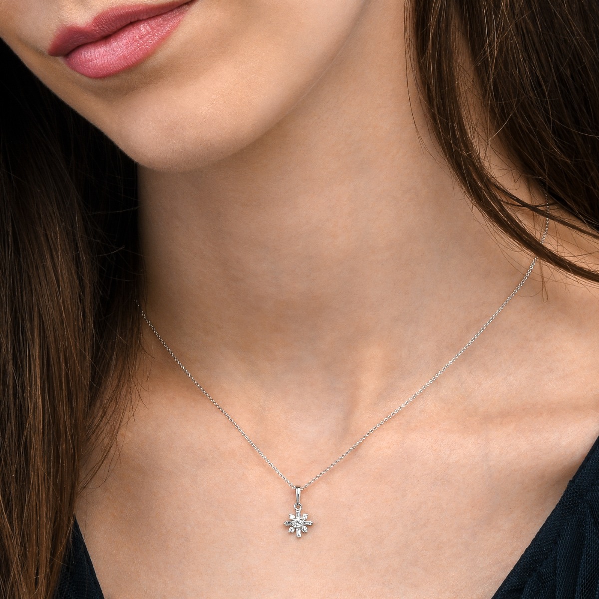 This beautiful white gold cluster diamond pendant has 0.25ct brilliant round and baguette diamonds set to create a dazzling design in flower formation. This necklace is made in 9K white gold and comes complete with a beautiful mirror trace chain.