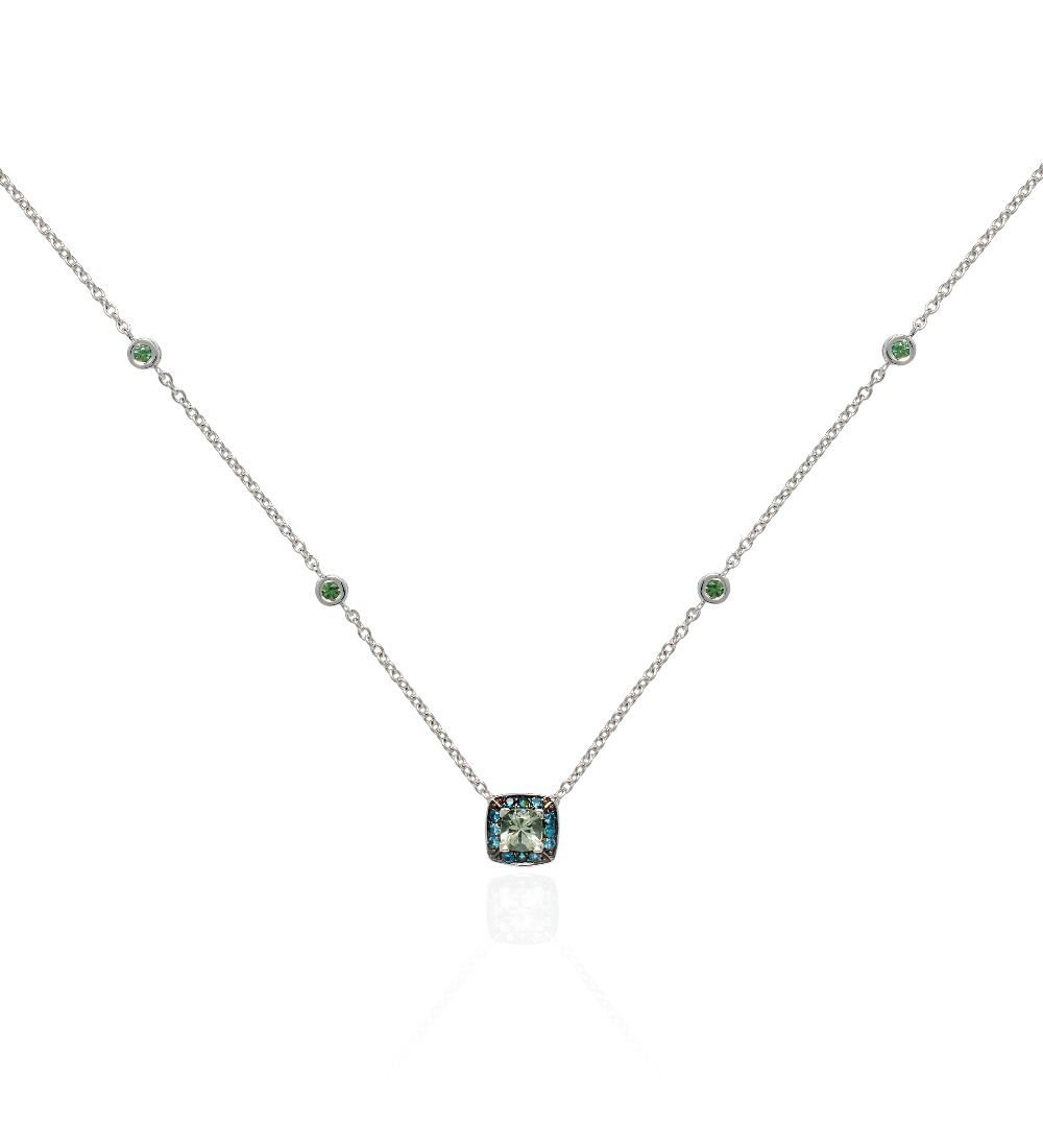 This stunning green amethyst and London blue topaz necklace is set with 0.41ct of green amethyst - Prasiolite -,0.13ct of London blue topaz, and 0.12ct of green sapphire gemstones. Audacious and striking the London blue topaz complement gracefully the pastel colour of the Prasiolite and green sapphires. This cushion-shaped pendant on a gem-studded chain is crafted in 18K white gold. Classic yet contemporary, this colourful necklace is sure not to go unnoticed.