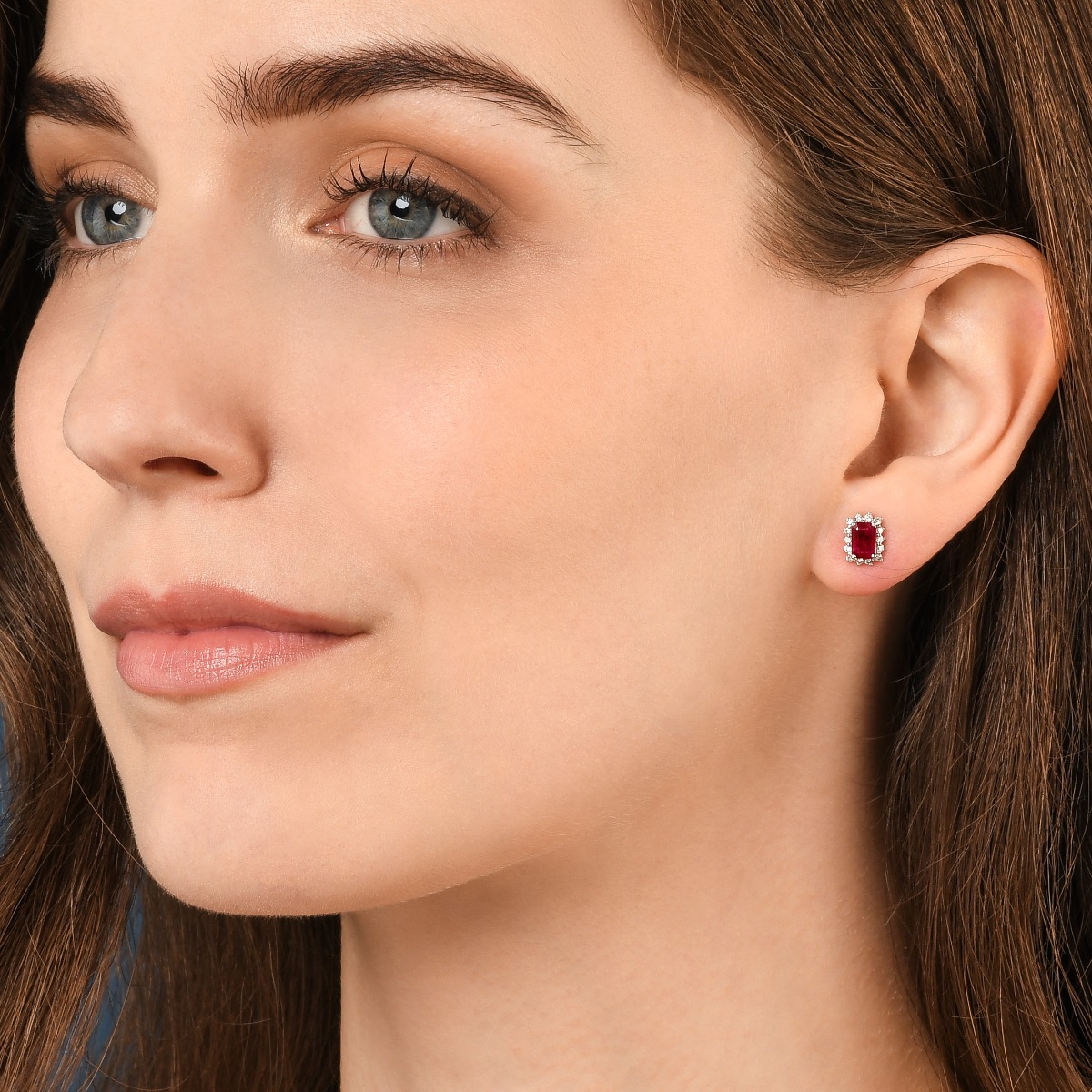 These alluring red Ruby and diamond Earrings features Octagon cut Rubies which are beautifully complimented by a halo of round diamonds set around them. The Earrings are designed with the centre Rubies slightly raised above the diamonds around them. The Rubies are 4mm x 6mm in dimensions and are carefully selected and cut to give the brilliance and colour that all high end jewellery should have. The bright white diamonds weight 0.28ct and beautifully lift the colour of the centre gemstones creating a perfect contrast. These Ruby Earrings are made in 18K white gold and come complete with a pair of secure butterfly push on backs.