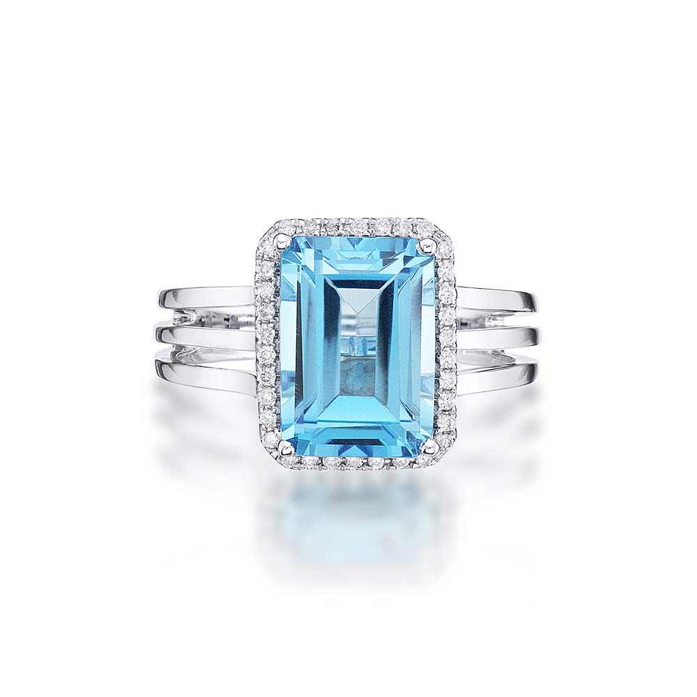This sensational Blue Topaz and Diamond Ring is set with an exceptional quality 3.70ct Emerald Cut Blue Topaz surrounded by a 0.10ct halo of white diamonds. The ring is made in 18K White Gold polished to give a beautiful mirror finish.