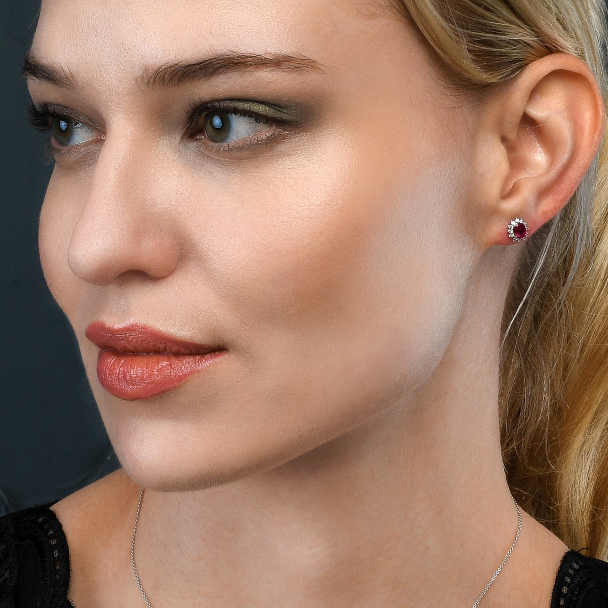 These classic red Ruby and diamond Earrings features oval cut Rubies which are beautifully complimented by a halo of round diamonds set around them. The Earrings are designed with the centre Rubies slightly raised above the diamonds around them. The Rubies are 4mm x 5mm in dimensions and are carefully selected and cut to give the brilliance and colour that all high end jewellery should have. The bright white diamonds weight 0.23ct and beautifully lift the colour of the centre gemstones creating a perfect contrast. These oval Ruby Earrings are made in 18K white gold and come complete with a pair of secure butterfly push on backs.