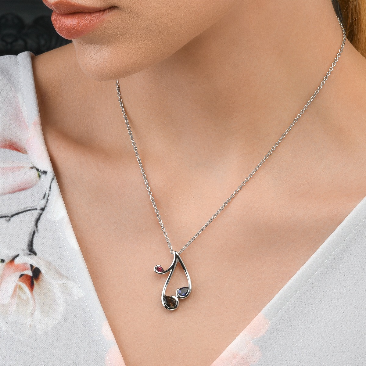 Elegant pendant set with Smoky Quartz, Iolite and Rhodolite, this necklace comes with an adjustable 18-inch chain with extra links allowing you to wear it to 16 inches and 17 inches.