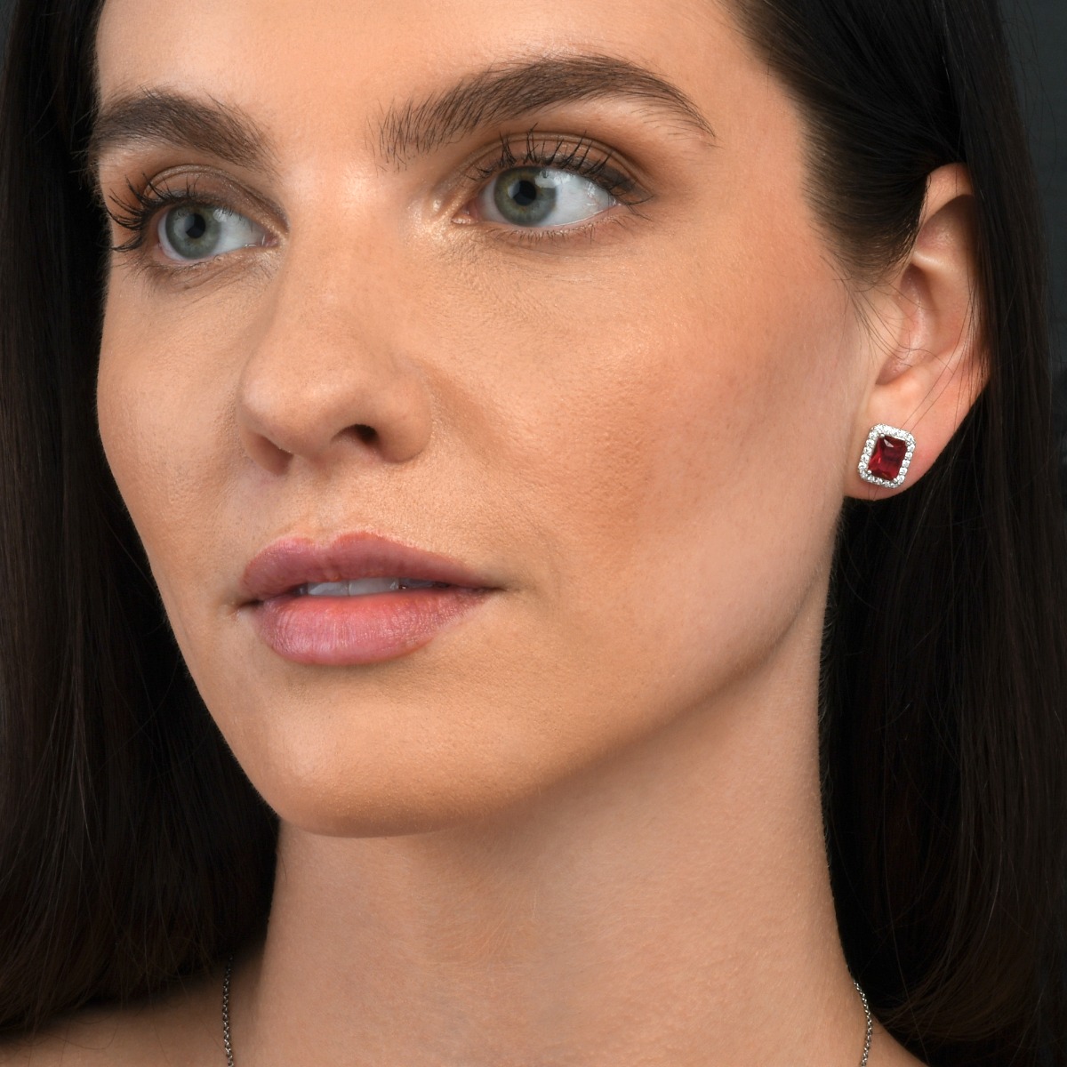 These elegant and distinguished stud earrings are elegantly set with emerald cut pink red stones with a halo of sparkling cubic zirconia stones. The red stones and delicate cubic zirconia stones are brought together in refined, elegant sterling silver settings.