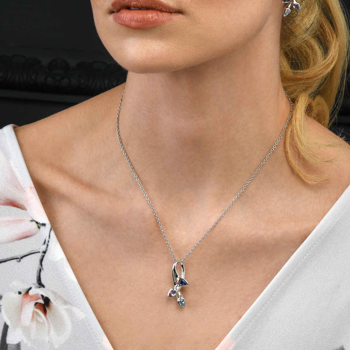 Elegant pendant set with an Amethyst, a Blue Topaz and an Iolite, this necklace comes with an adjustable 18-inch chain with extra links allowing you to wear it to 16 inches and 17 inches.