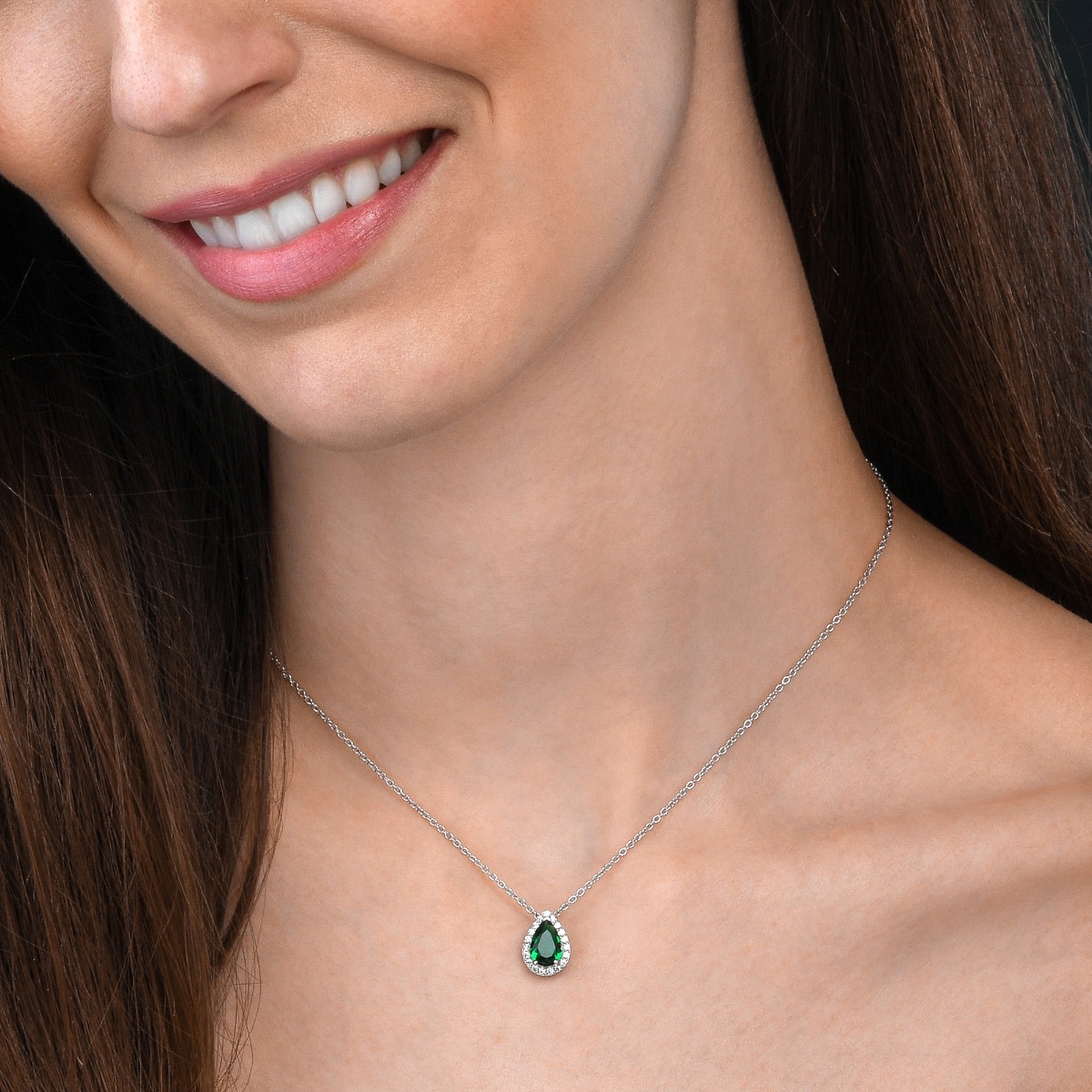 This elegant and distinguished green pendant necklace is elegantly set with a pear-shaped green stone with a halo of sparkling cubic zirconia stones. The deep green stone and delicate cubic zirconia stones are brought together in refined, elegant sterling silver settings.