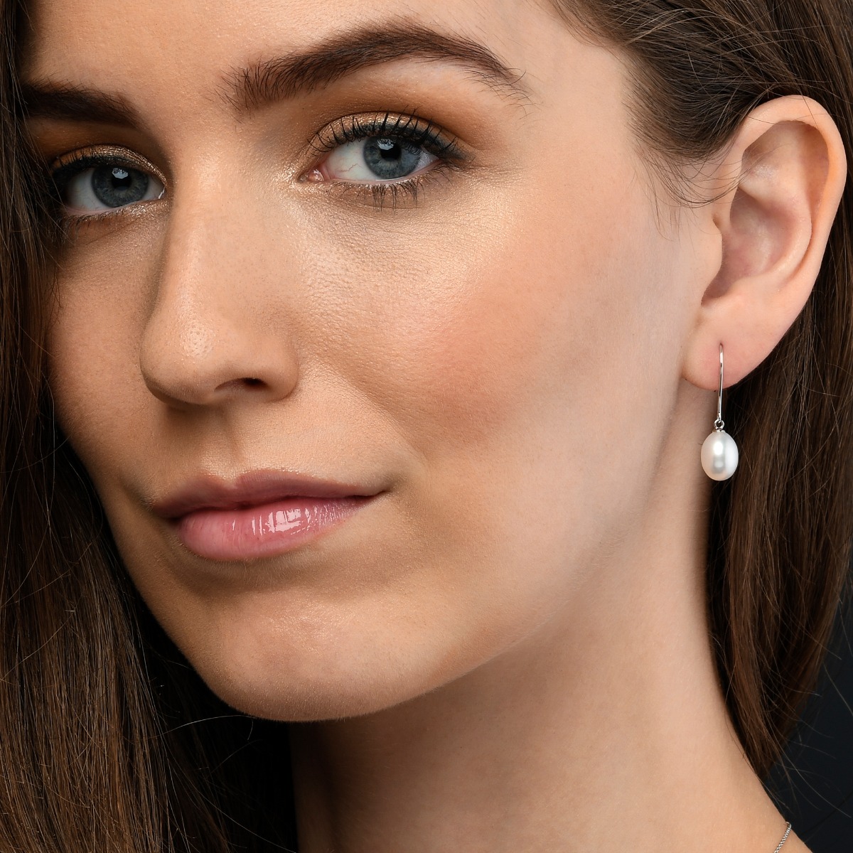 Stylish, classic drop earrings with freshwater pearls in 925 sterling silver. These earrings are set with 8-8.5 mm premium quality white drop shape freshwater cultured pearls. The simple fishhook style of earrings means that they are easy to wear on a daily basis. The design looks elegant and is a classic to match most attires and adds that touch of elegance to all occasions. The sterling silver earrings are plated with bright white rhodium plating to enhance the colour and protect the silver earrings from tarnishing.