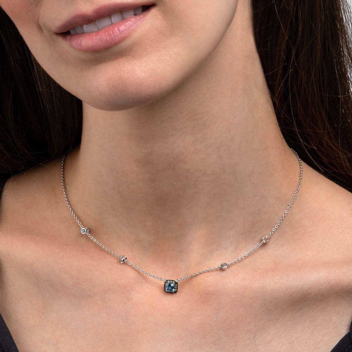 This stunning blue topaz and peridot necklace is set with 0.70ct of blue topaz and 0.10ct of peridot gemstones. Audacious and striking the peridot gemstones contrast gracefully with the light blue of the topaz. This cushion-shaped pendant on a gem-studded chain is crafted in 18K white gold. Classic yet contemporary, this colourful necklace is sure not to go unnoticed.
