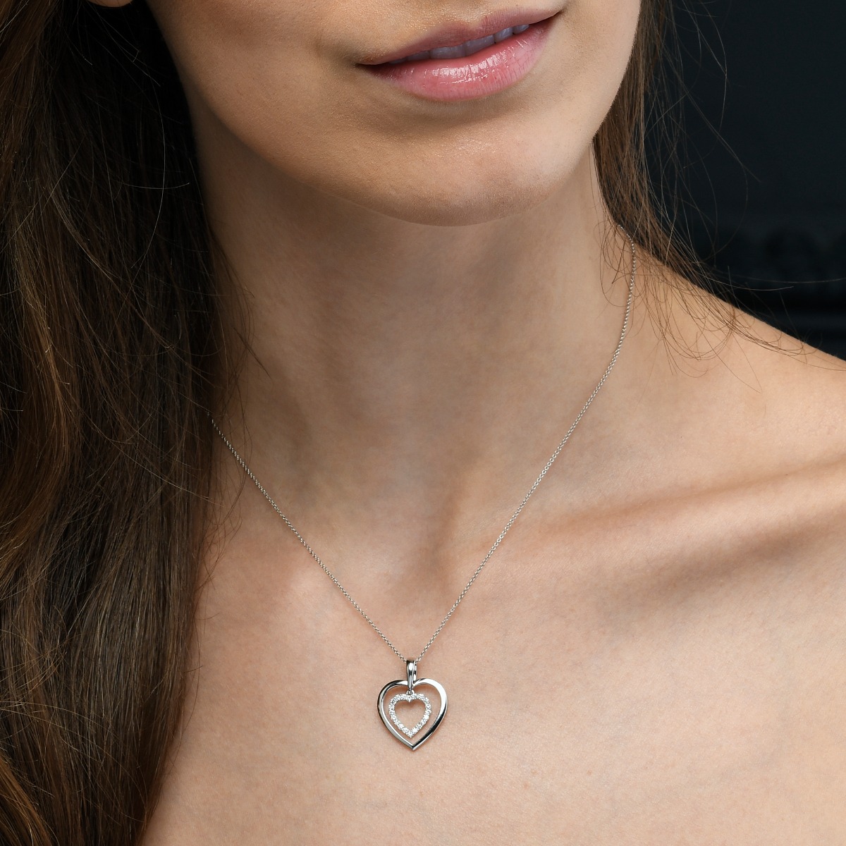 This elegant white gold diamond pendant has 0.23ct diamonds. The pendant features two carved hearts one beautifully polished and the other encrusted with round brilliant cut diamonds. This necklace is made in 9K white gold and comes complete with a beautiful mirror trace chain.